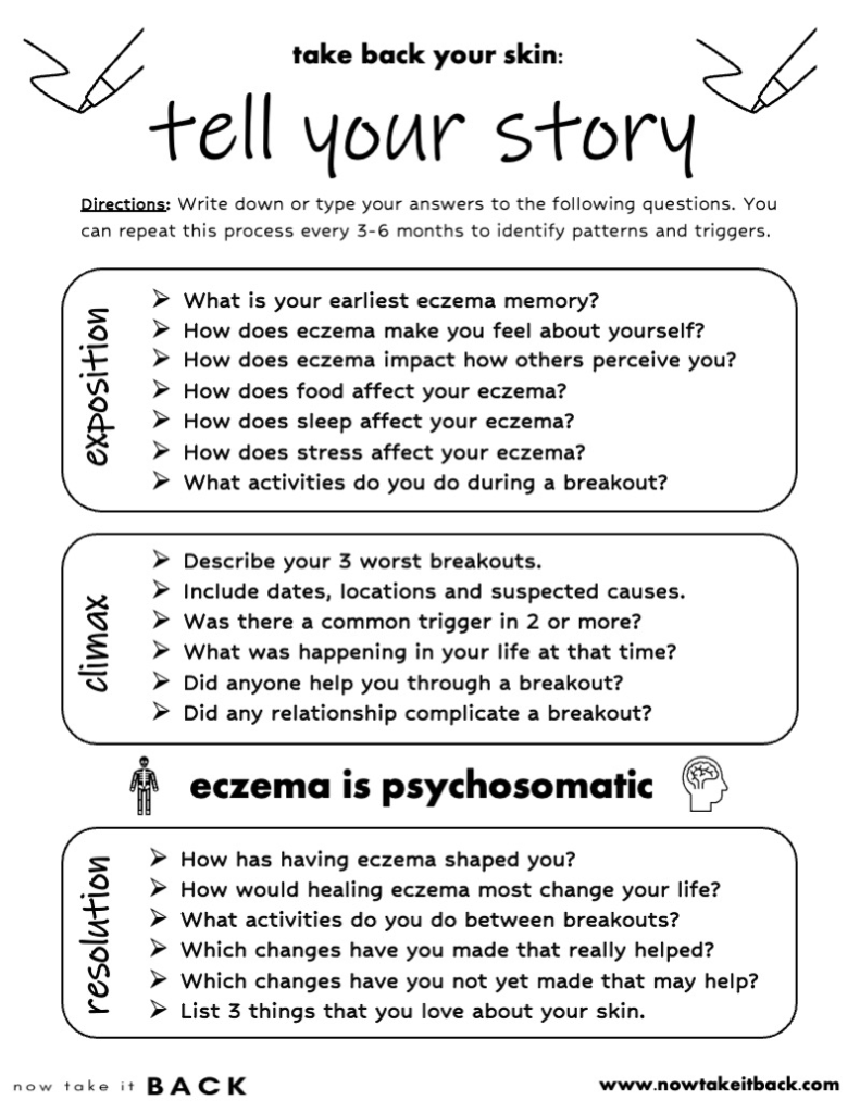 If you struggle with writing, ask someone you love and trust to be your transcriptionist—to ask you each question and type out your answer without any commentary. This is where you start addressing the connection between eczema and your mental health. You can download the pdf below:
